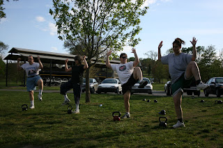 New bootcamp photos by irontamer | Jun 3, 2007 | Blog | Is this some crazy rain dance Shane made up? No, it’s a drill based on Thai boxing techniques. It’s great for the obliques! Here is Phillip, Elizabeth, Shane and Heather doing snatches until I got tired. After I got tired I had them do swings.